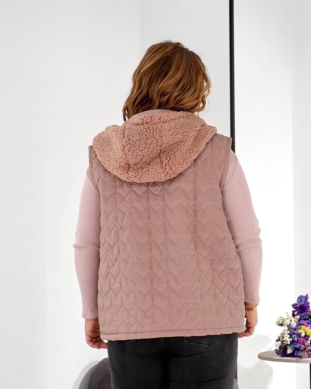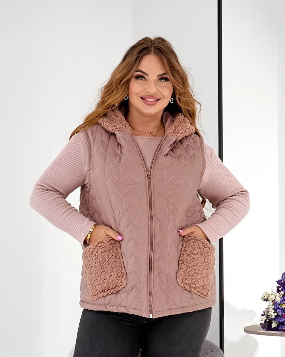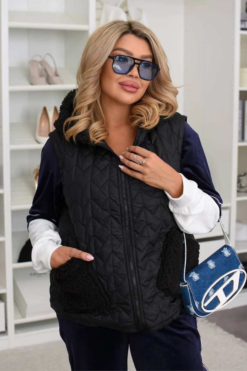 Капюшон і кишені виконані з м’якої тканини Тедді, що додає затишку та стильного акценту образу. Жилетка чудово поєднується зі світшотами, худі та теплими костюмами.
