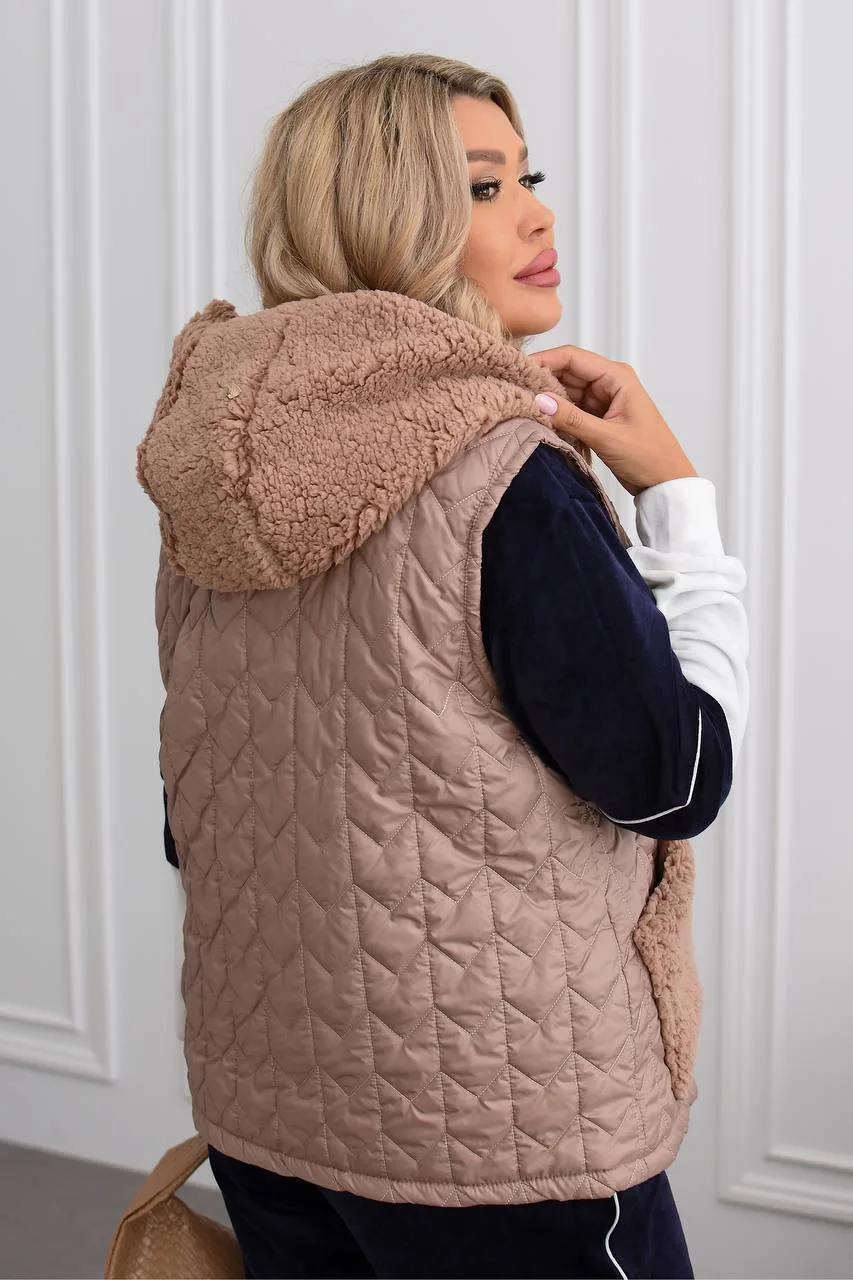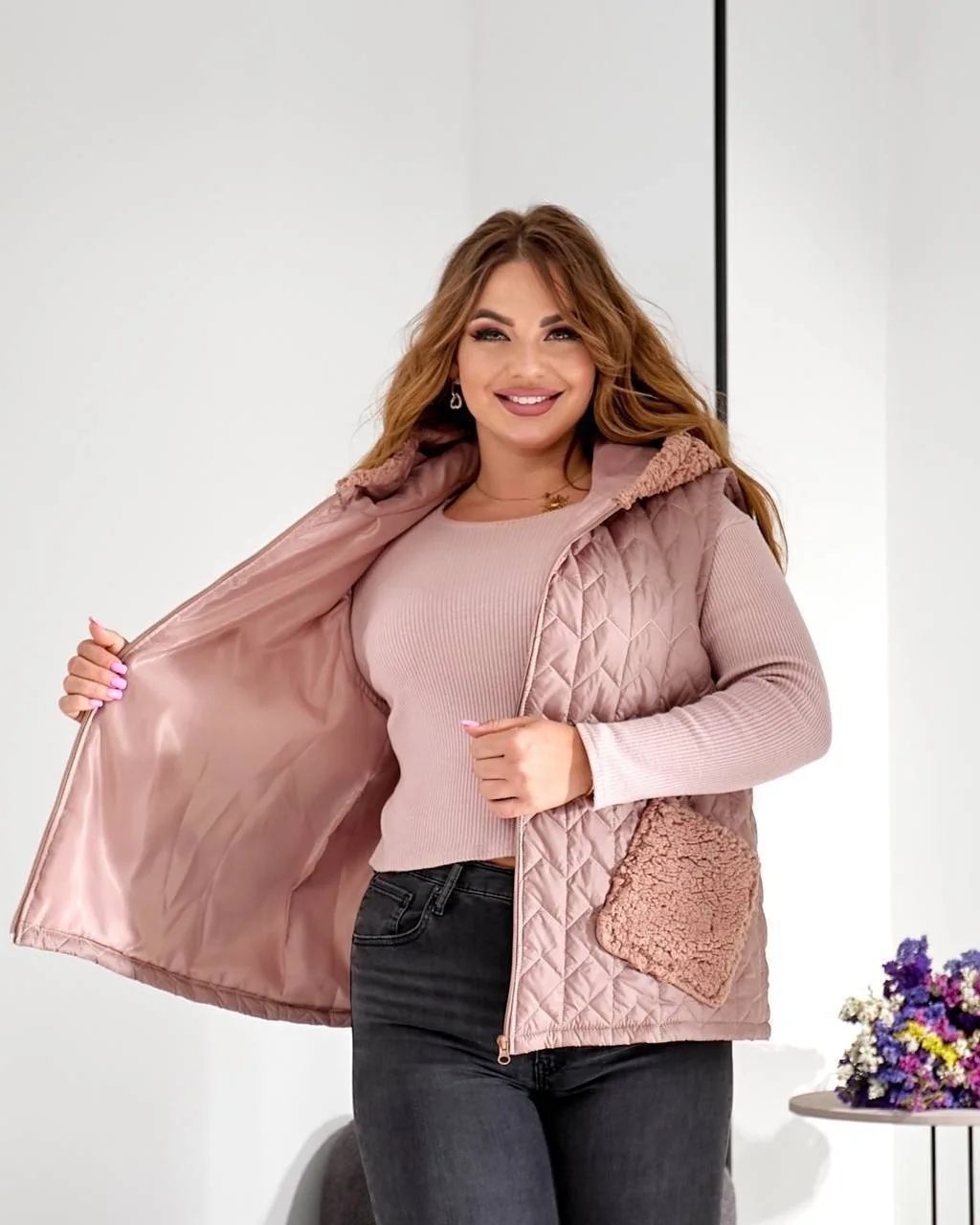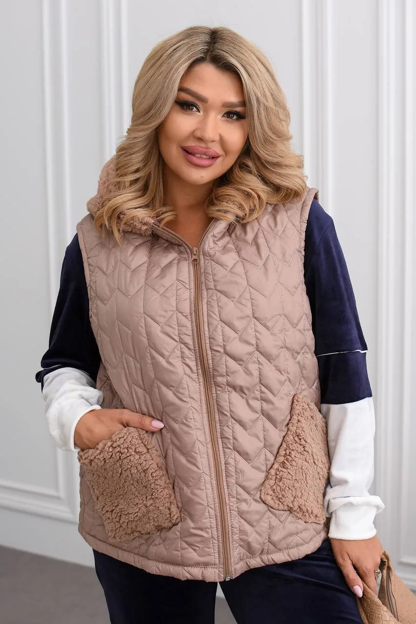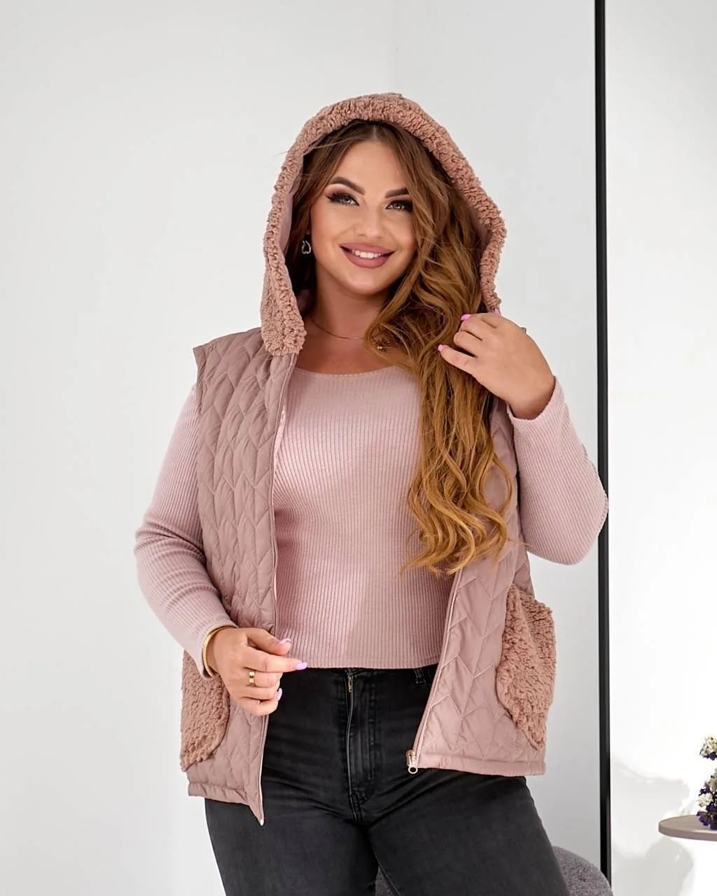 Капюшон і кишені виконані з м’якої тканини Тедді, що додає затишку та стильного акценту образу. Жилетка чудово поєднується зі світшотами, худі та теплими костюмами.