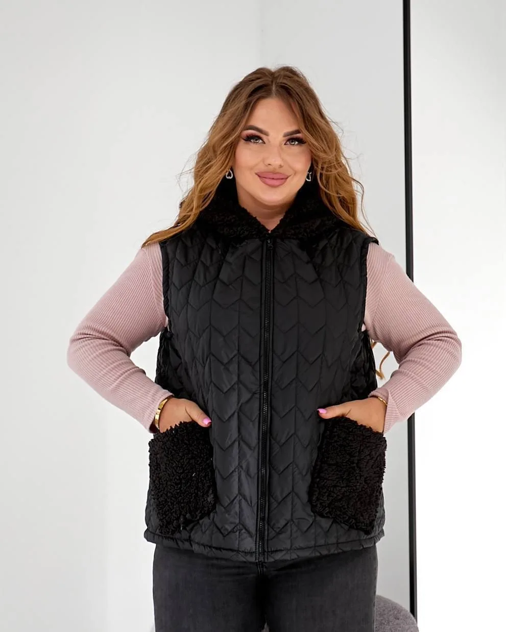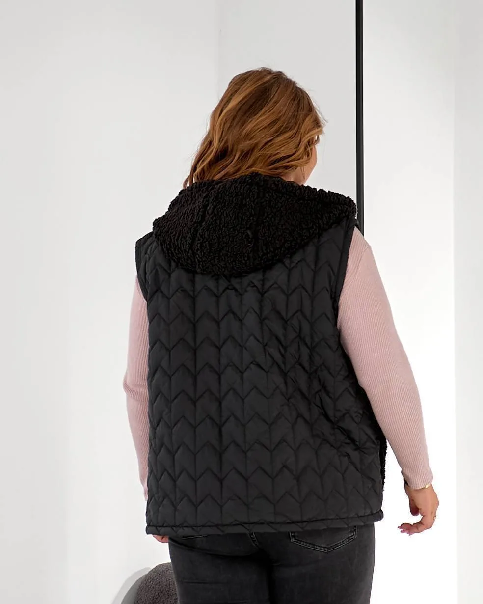 Капюшон і кишені виконані з м’якої тканини Тедді, що додає затишку та стильного акценту образу. Жилетка чудово поєднується зі світшотами, худі та теплими костюмами.