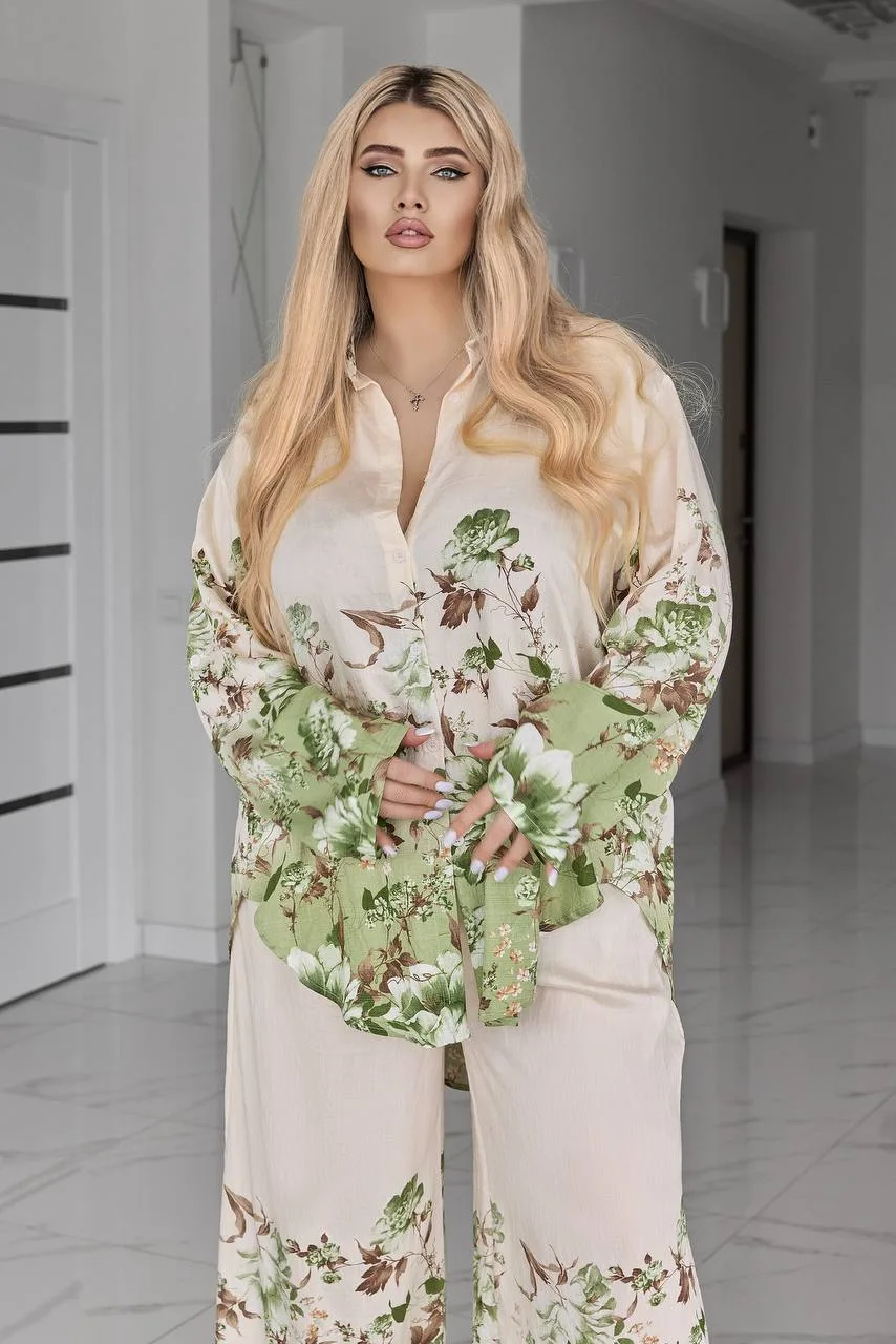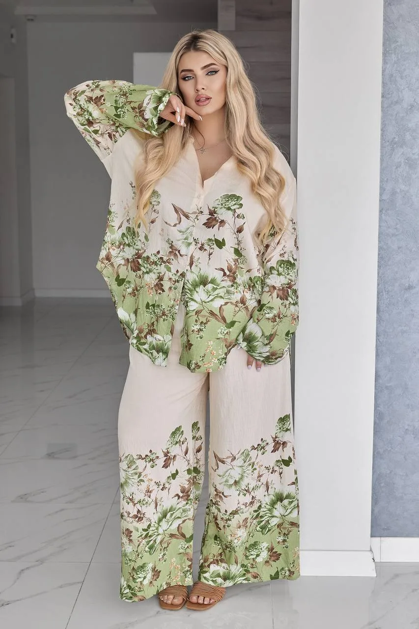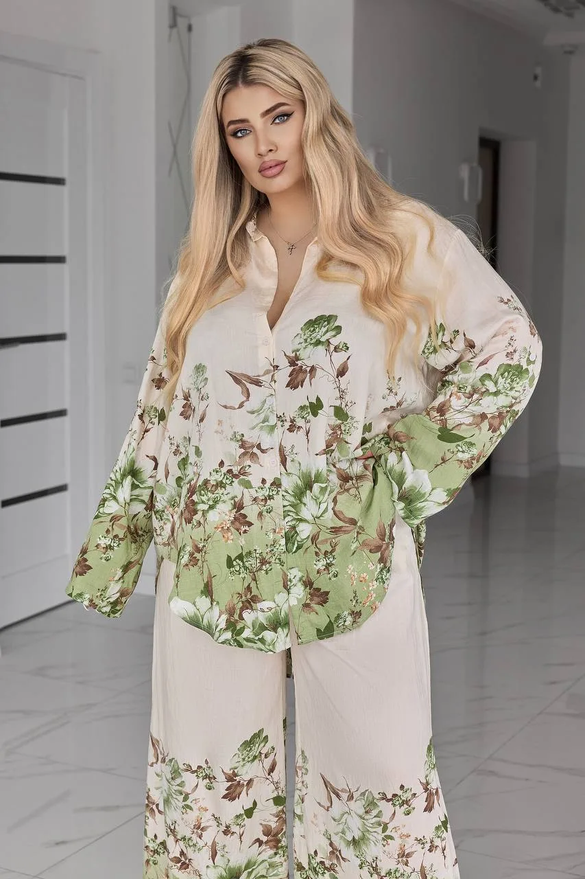 Стильний жіночий костюм великого розміру — ідеальне поєднання комфорту та витонченості. Модель виконана з легкої, дихаючої віскози, що дарує відчуття невагомості та свободи рухів навіть у спекотні дні.
