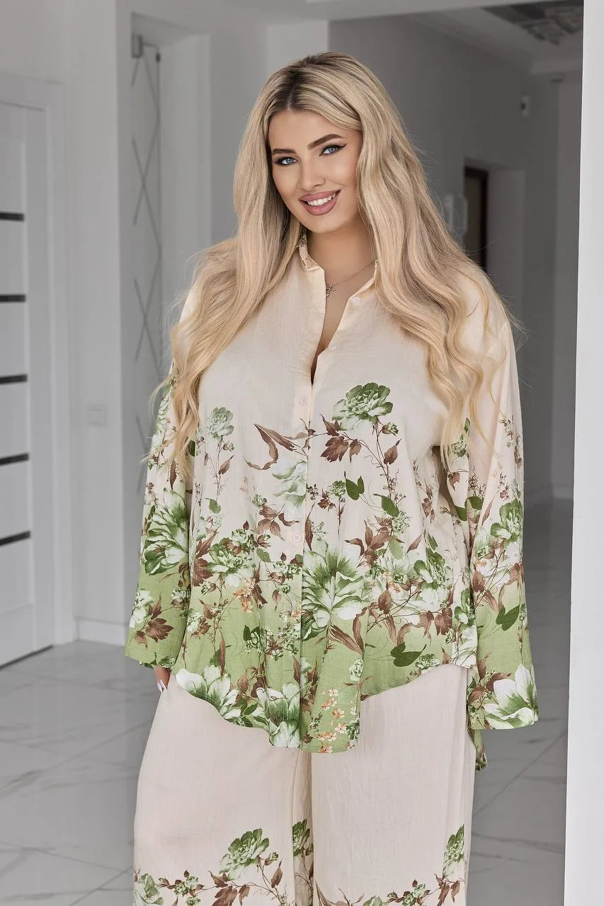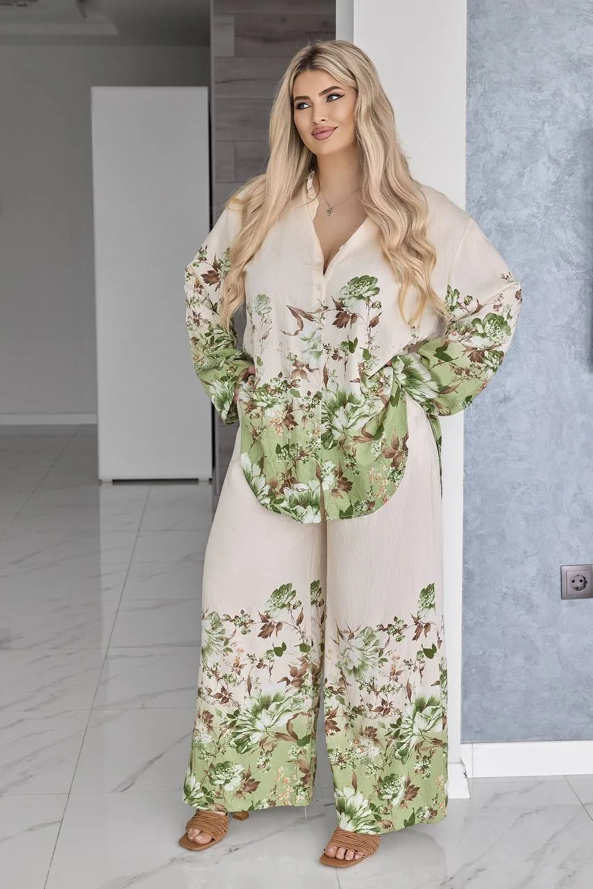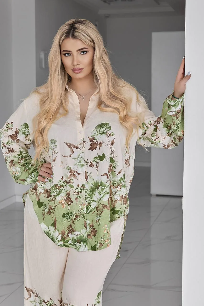 Стильний жіночий костюм великого розміру — ідеальне поєднання комфорту та витонченості. Модель виконана з легкої, дихаючої віскози, що дарує відчуття невагомості та свободи рухів навіть у спекотні дні.