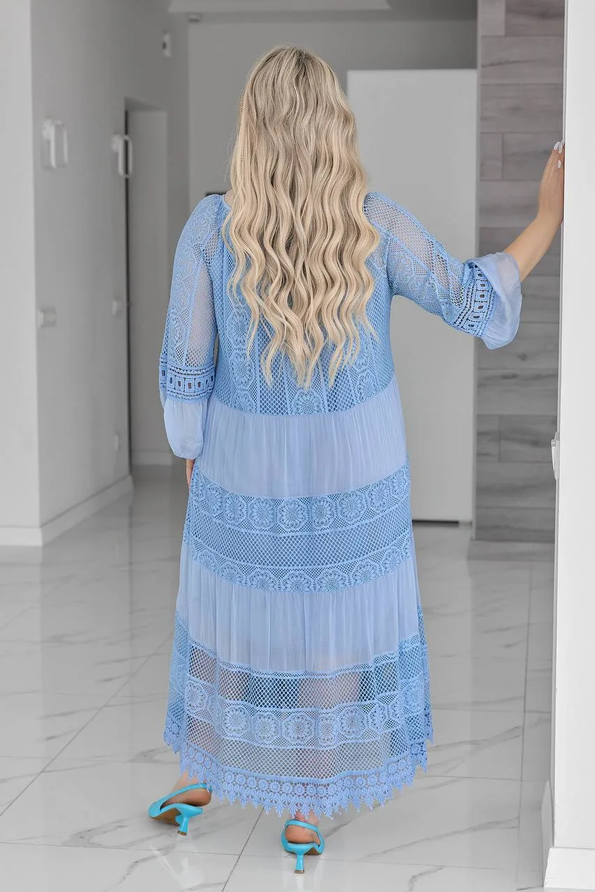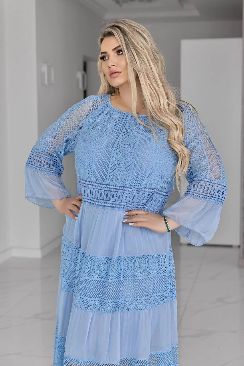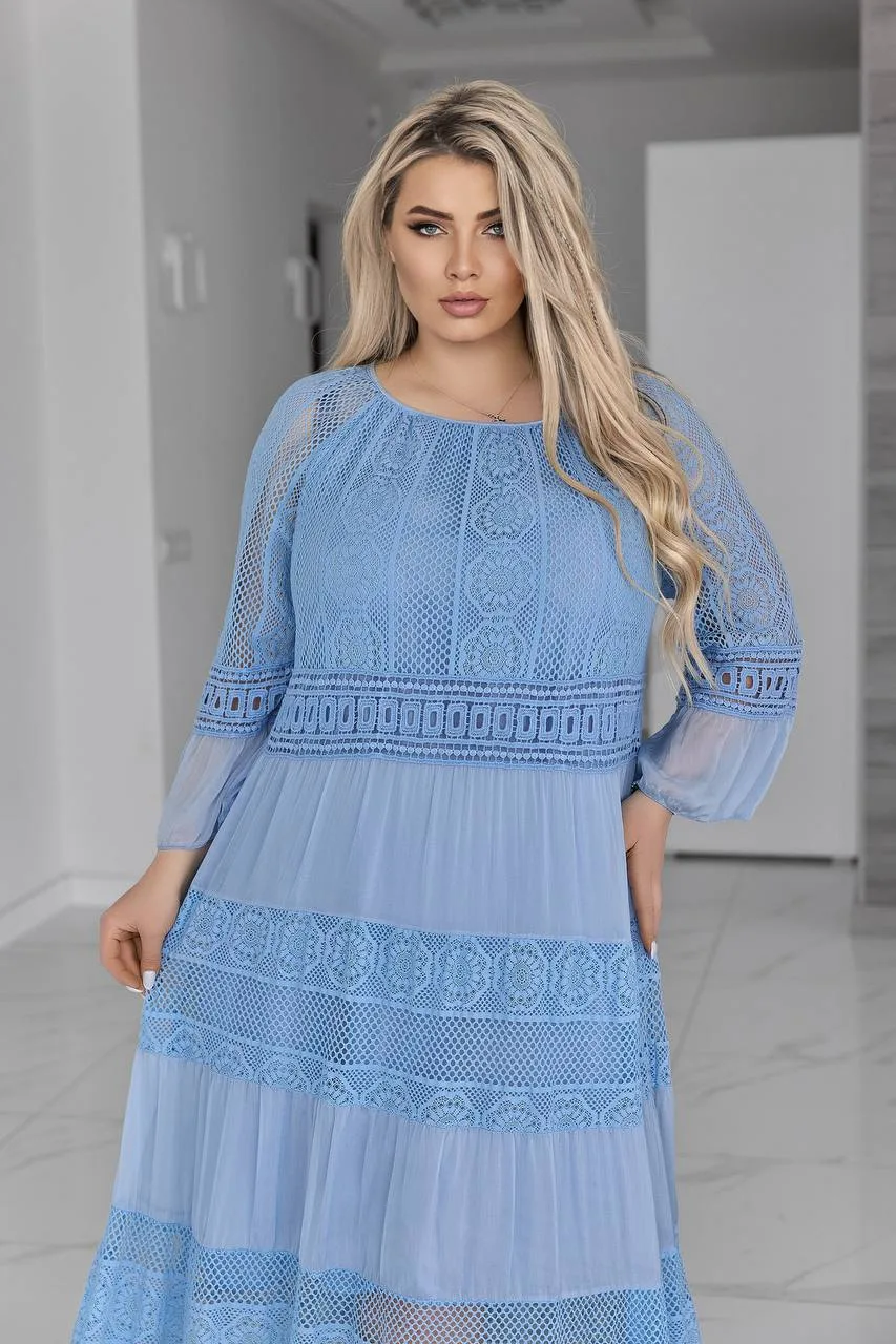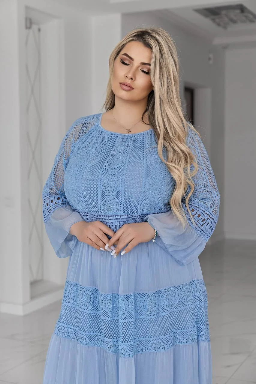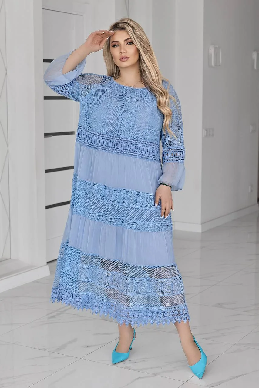 Елегантна жіноча сукня великого розміру створена для тих, хто цінує комфорт і витонченість у кожному образі. Вільний крій м’яко підкреслює жіночність, не обмежуючи рухів, а делікатні мереживні вставки додають особливого шарму та святковості.
