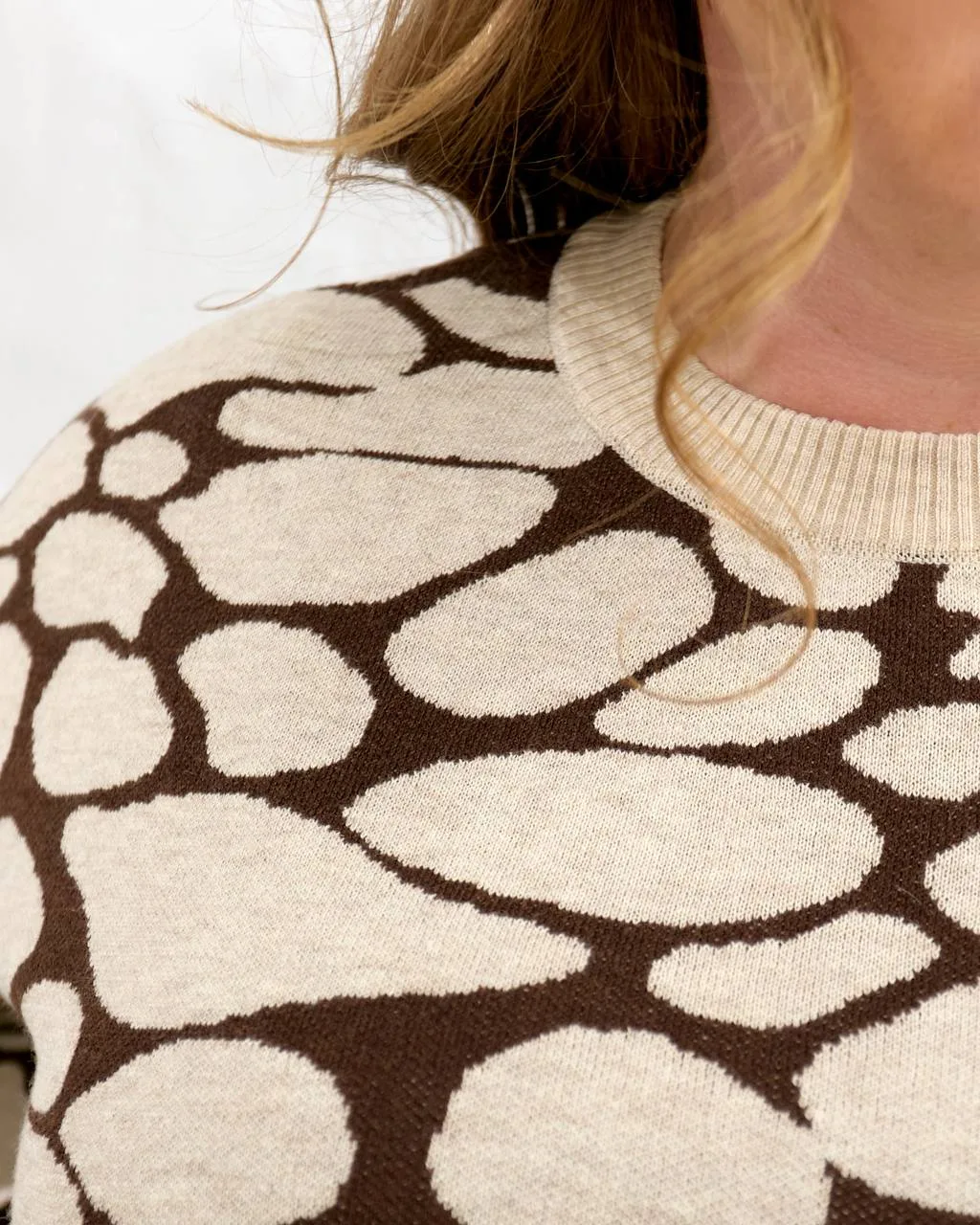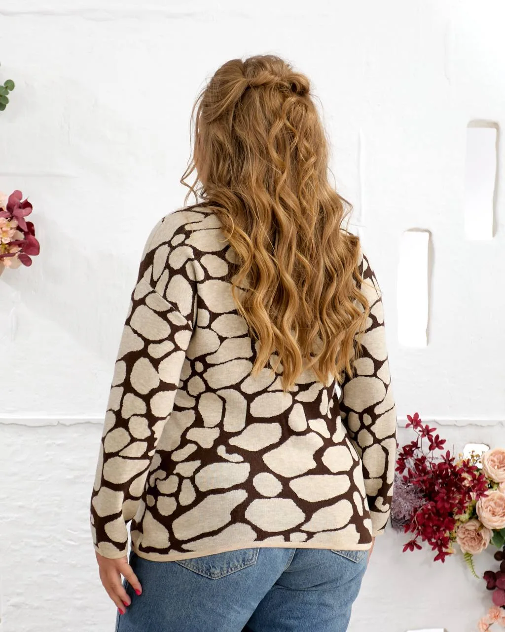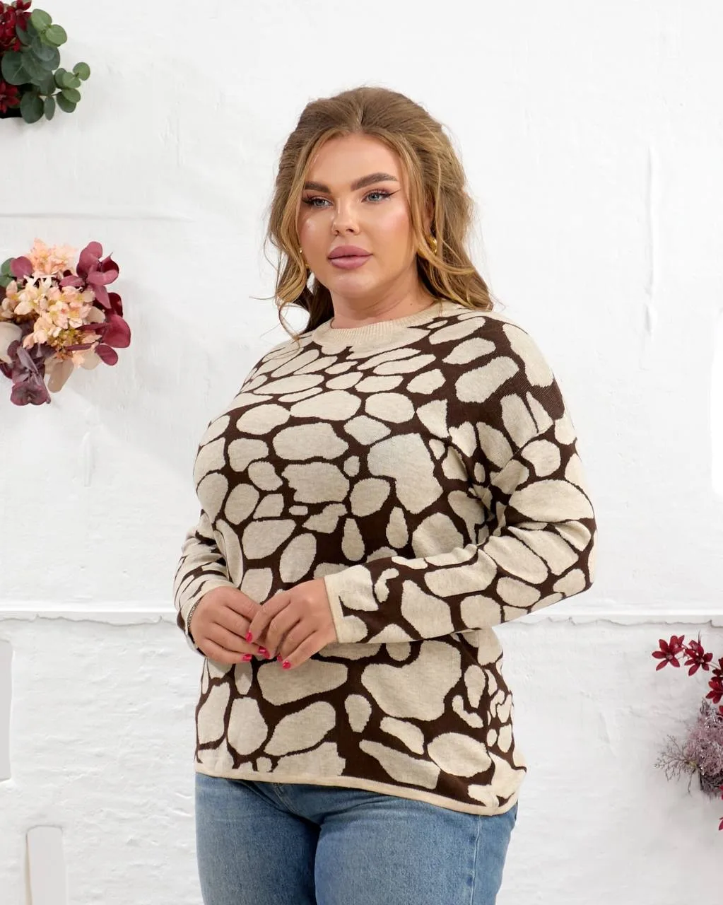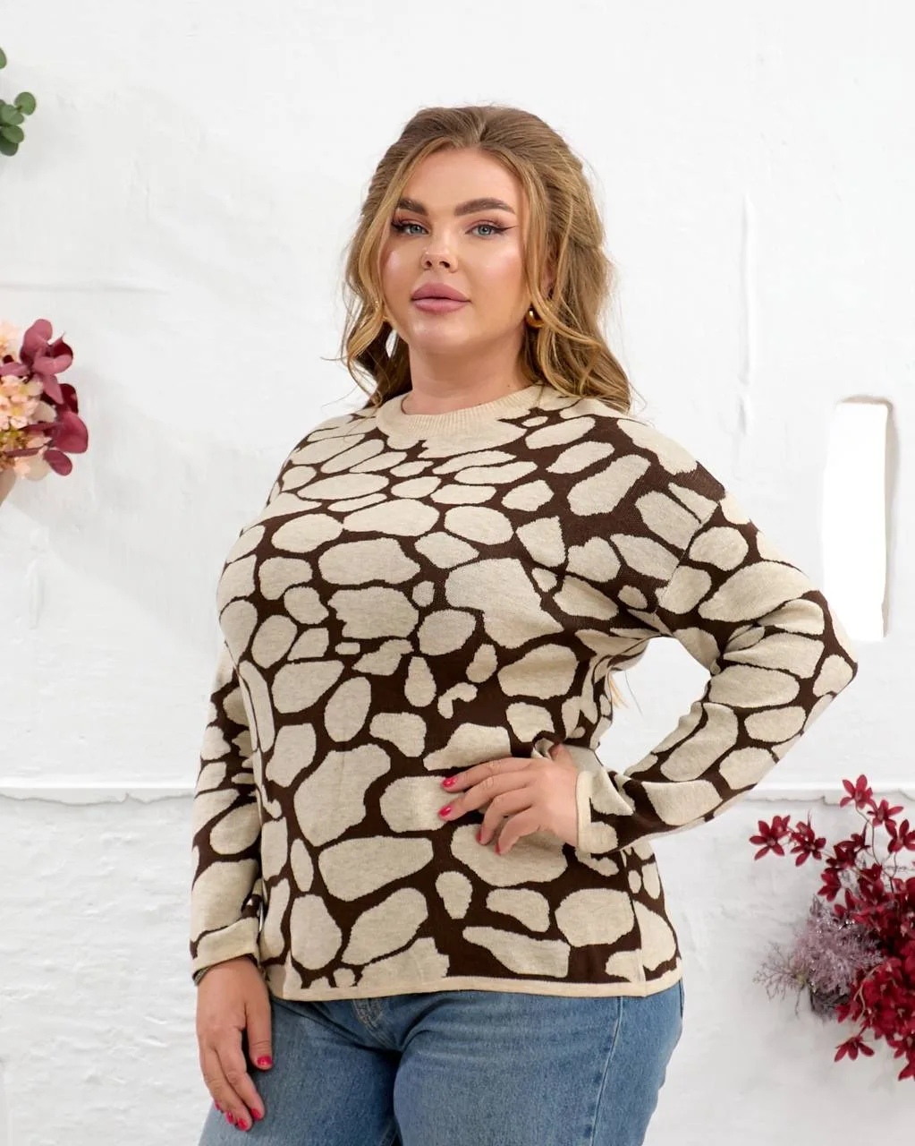 Стильна принтована кофта жіноча з шерсті, поліестеру, нейлону та акрилу. Розміри 50–56, обхват грудей і стегон 124 см. Комфортна, тепла, у сірому, бежевому та коричневому кольорах. Купити онлайн з доставкою по Україні.
